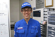 整備士の宮園と申します。私は小さい頃からとにかく車が好きで子供の頃はプラモデルやラジコンなど作っては遊んで壊して、それを直してまた遊んでました。今では子供の頃の遊びが私の仕事を決めたと言っても過言ではありませんね。そんな私が勤める当社では点検整備はもちろん、カスタマイズも得意なので、ぜひ足を運んで見てください。スタッフ一同ご満足いただけるよう頑張ります。ちなみに私の愛車のスイフト(1.3LのMT車)はスズキスポーツのエアファンネルクリーナーを付けてますが、ノーマルマフラーでもエンジン回転数を上げるといい音しますよ!